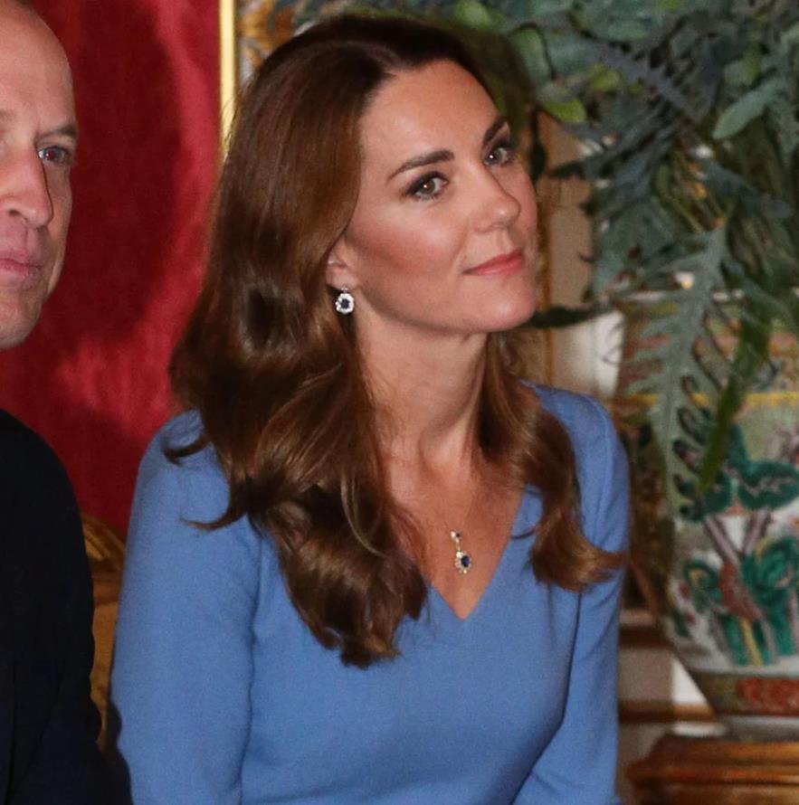 当凯特王妃和威廉王子在白金汉宫会见乌克兰总统弗拉基米尔·泽连斯基(Volodymyr Zelensky)以及乌克兰第一夫人欧琳娜·泽伦斯卡(Olena Zelenska)时,她戴了一些之前没戴过的蓝宝石首饰:剪裁合身的蓝色束腰长裙以及一条看起来和戴安娜王妃大婚当天沙特王储送她的一对耳环很像的蓝宝石吊坠项链。