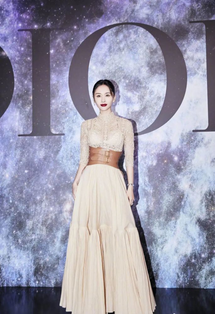 这条米色长裙配浅棕色腰封尽显柔美气息,而且这条长裙盖过高跟鞋,腿长看起来像一米八,气场太强了!