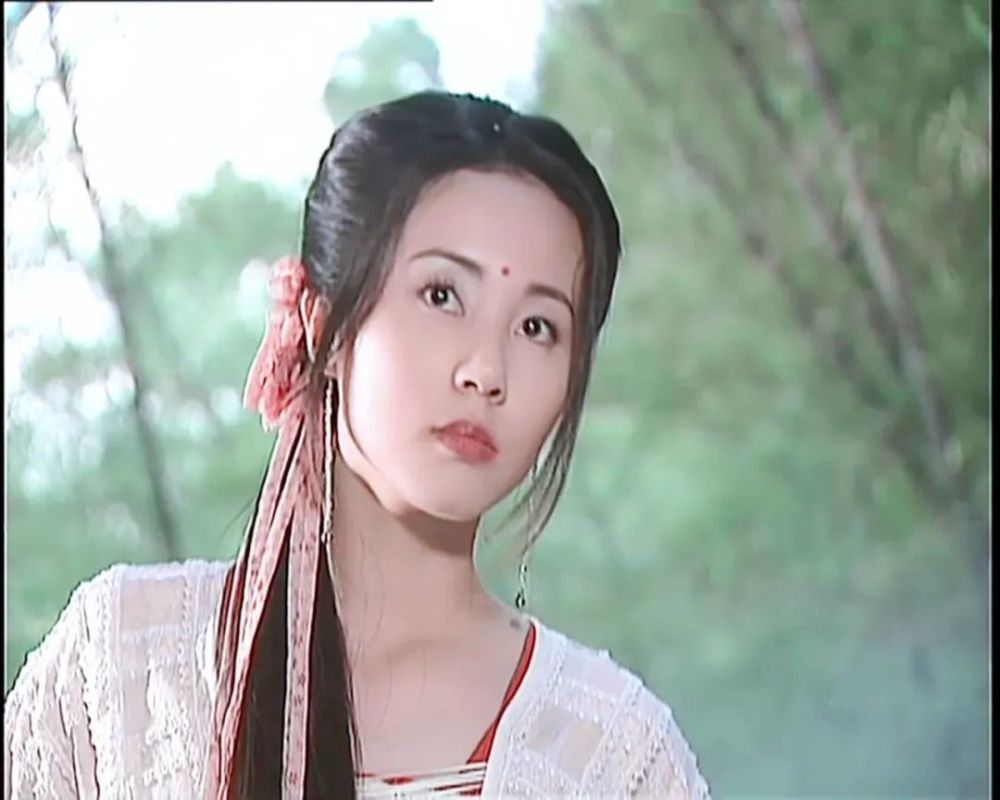 如果说青青是温婉可人的美娇娥,那么姚子平就是清丽无邪的小仙女,她的个性与《倚天屠龙记》中的小昭有点相似,既善解人意又让人心疼。造型师给梁小冰设计的妆发与青青有很大不同,编发为主,辅之发饰与发带,这里的发带极短,就像一个装饰品。